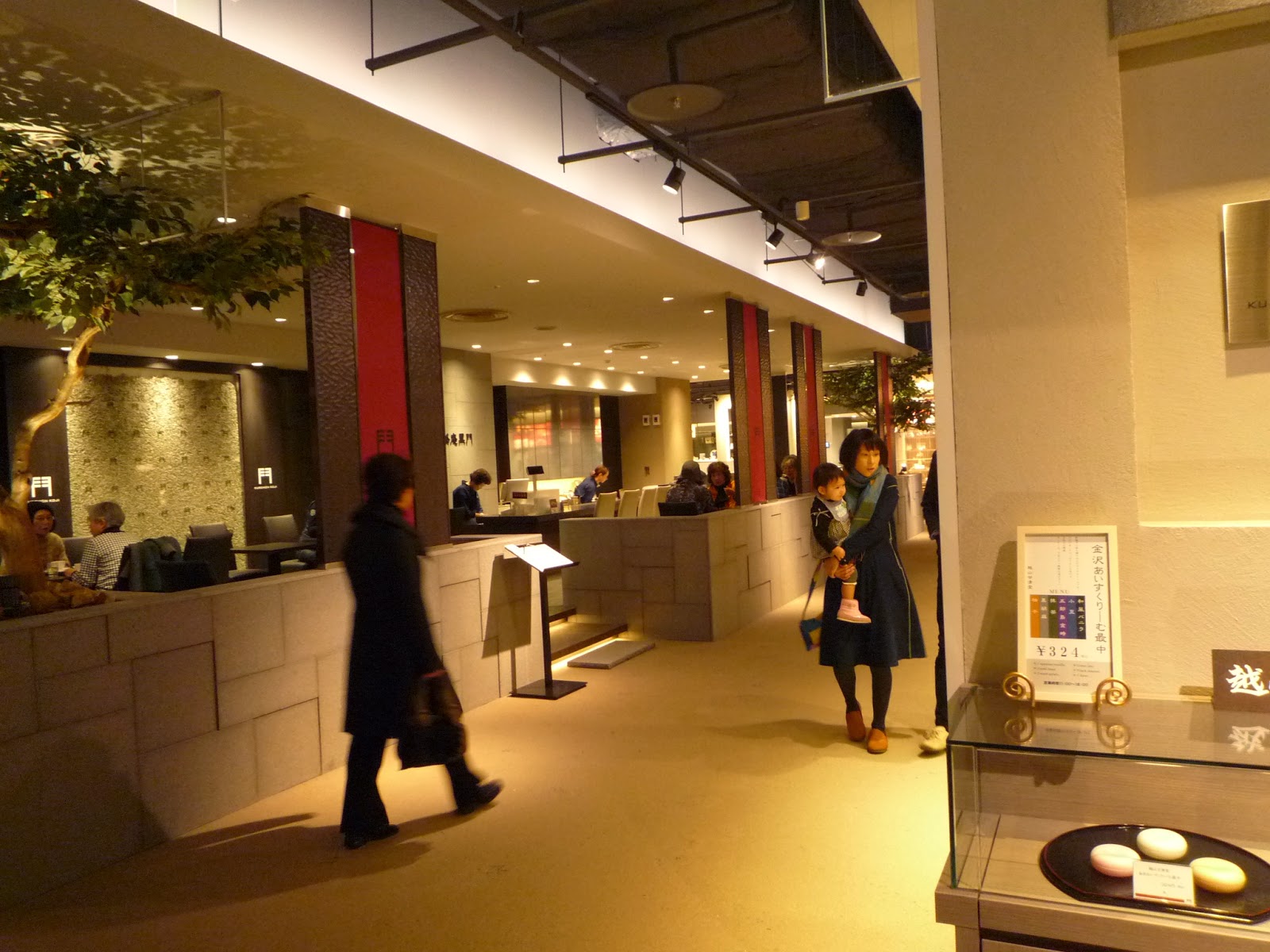 最近、1階の近江町側に観光客目当ての「黒門小路」というコーナができ、金沢名物の和菓子、北陸の地酒や海産物を売る店や「金沢棒茶」と甘味が頂ける喫茶「茶庵黒門」などがあった。