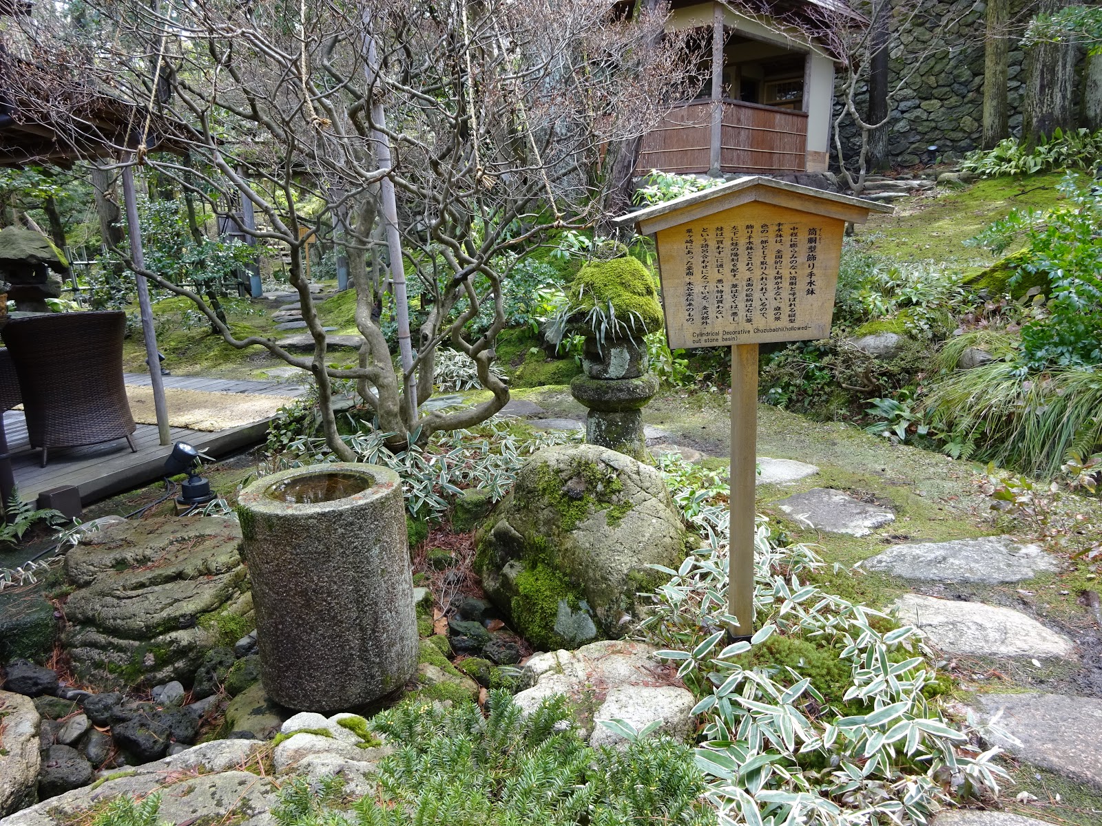 越前藩主松平家伝来の方形手水鉢で、公家や大名しか許されなかった桐葉の飾り陽刻がある。蹲には、台石と手燭石に能登産の滝石を、また、湯桶石には佐渡産の赤石などぜいたくな配石となっている。