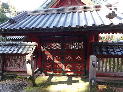 この惣門は、江戸時代の北の丸にあった「惣門」や「随身門」と違い、八脚門であり様式が違うので、明治時代後になってから建てられたものであろう。右側に大きな「尾崎神社」の標柱が建っている。